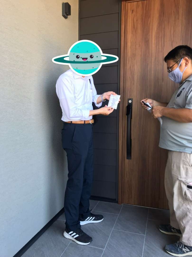 玄関にて、鍵のお引渡しをさせて頂いております(^^)
