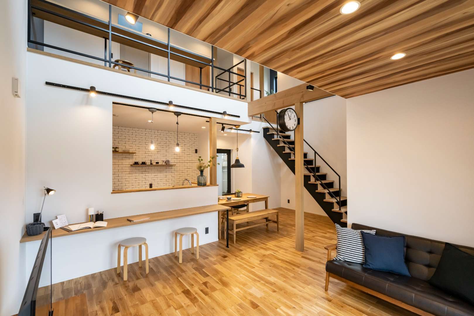 スケルトン階段&アイアン手すりの黒色が、空間の色合いを程よく締めています。ご支給品のDULTONの両面時計がとってもインテリアのポイントになっていました🕛