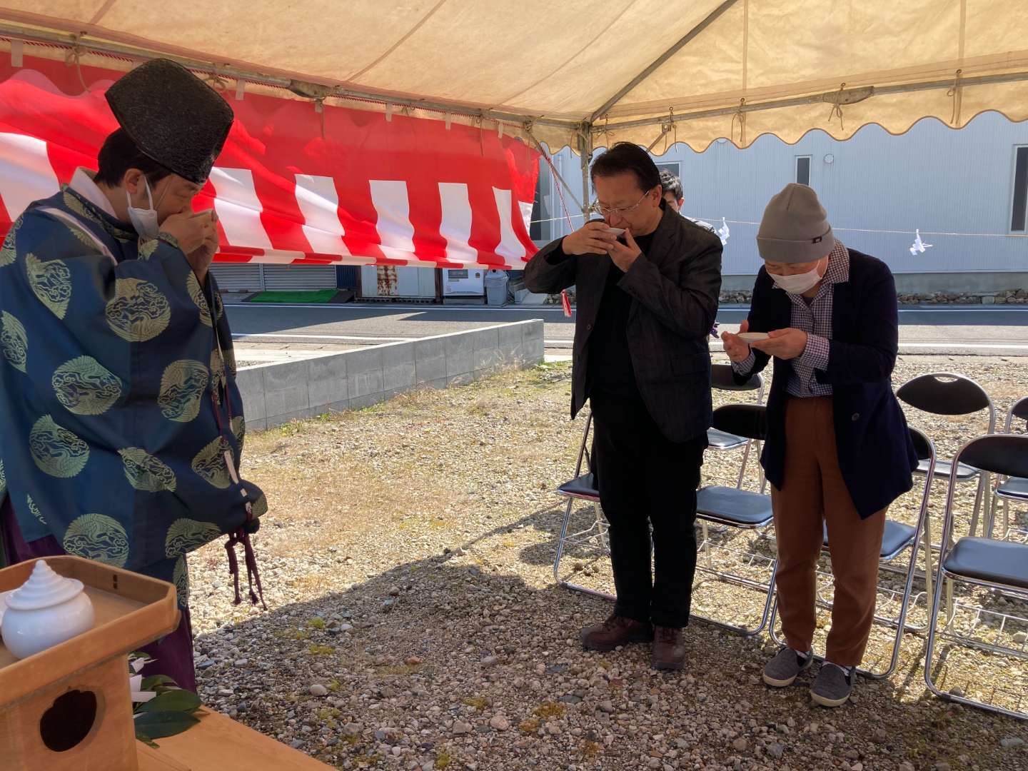 神主さんに修祓の儀や祝詞を奏上していただいた後、四方祓と言ってお施主様にもお酒・塩で土地の四方をお清めしていただきます。
