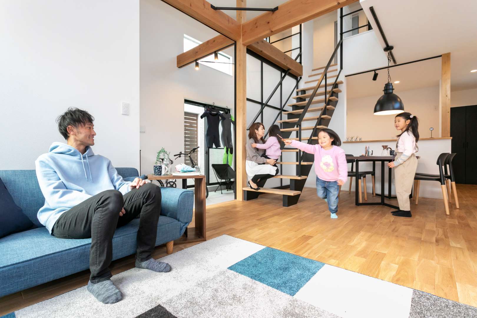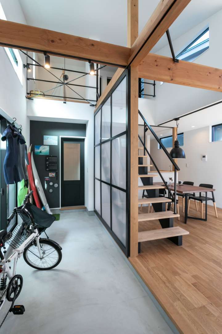 今回土間にはサーフボードなど趣味のアイテムを飾りました。