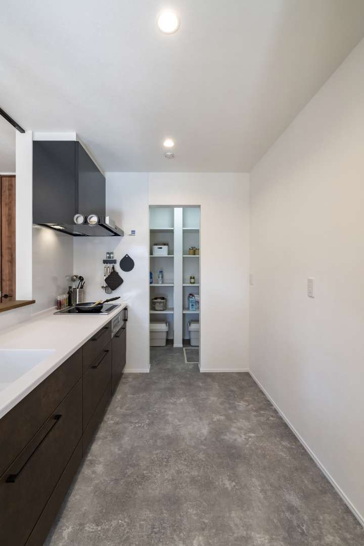 玄関ホールから通路に出て、パントリー↔キッチン↔ダイニング↔リビングを回遊できる動線です。