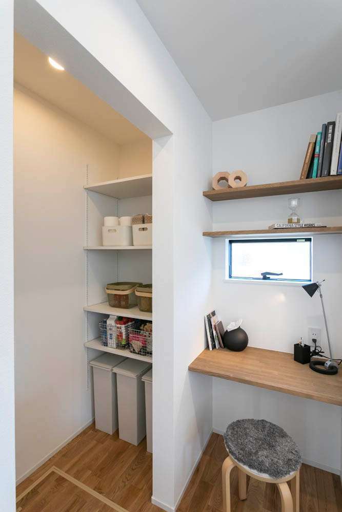 キッチン横のデスクスペースは家事の間のちょっとしたひと休みや、お子さんの勉強スペースとしても便利です。