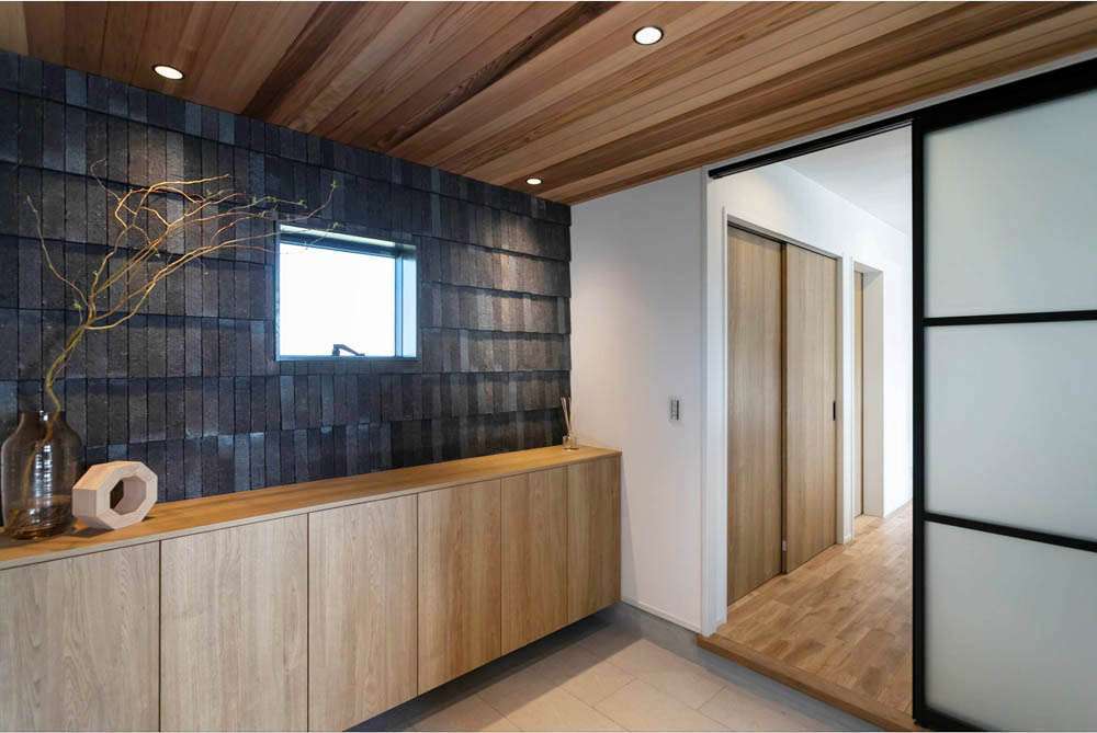 広めの玄関。下駄箱上のタイルがインテリアのポイントです。