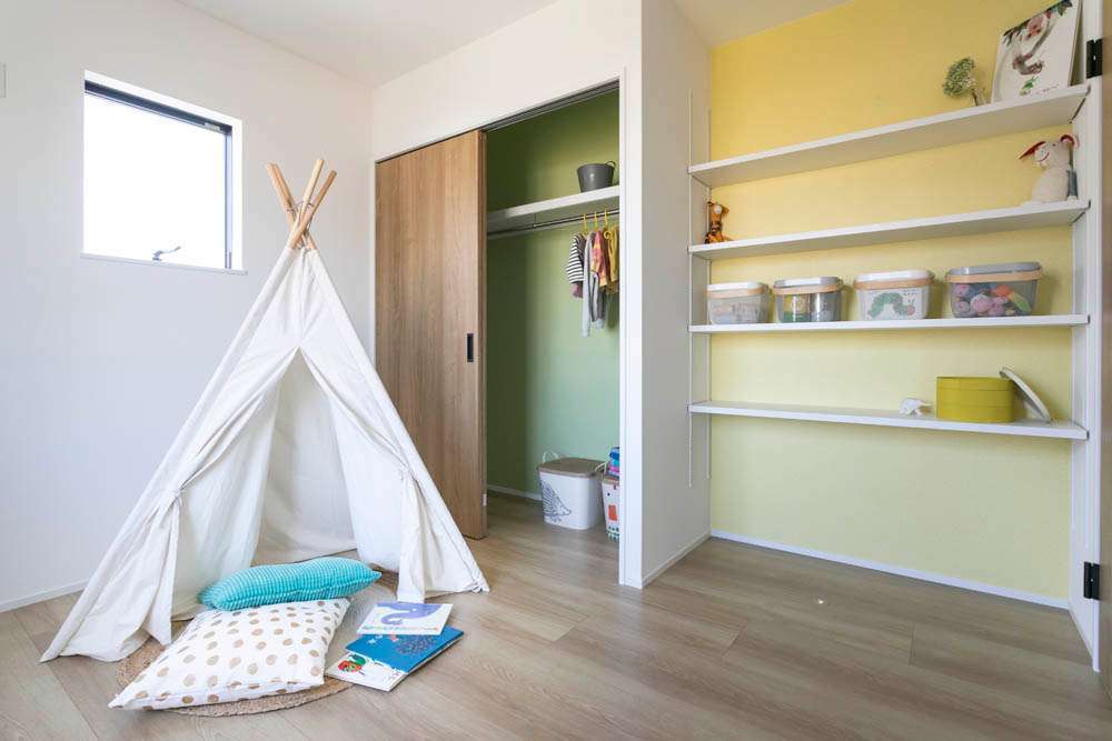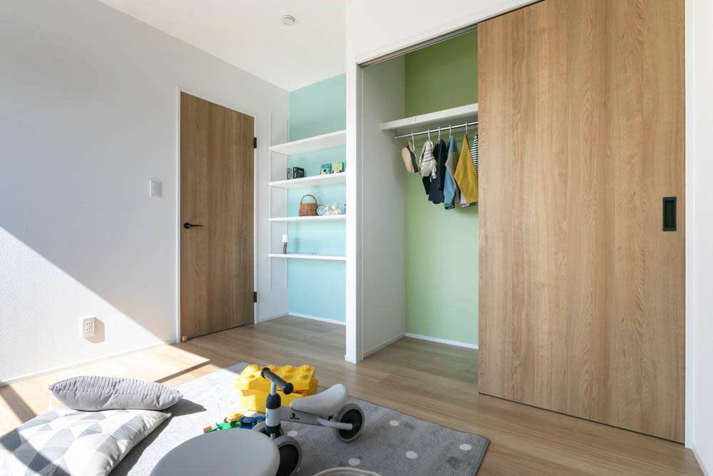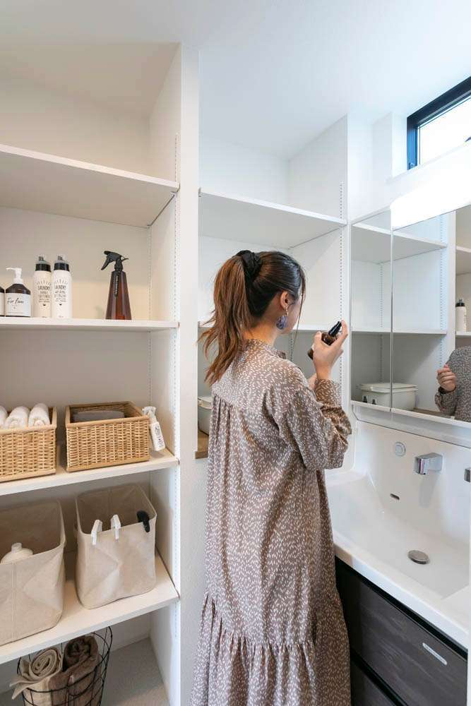 壁の凹みを利用した可動棚の収納が便利。